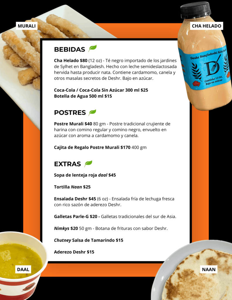 La comida de Bangladesh es muy parecida a la comida del norte de la India pero con más uso de carne y sazones por la influencia del imperio que construyó el Taj Mahal (el imperio Mughal), al igual que el uso de verduras y otros ingredientes tropicales como se usan en Myanmar y Tailandia.